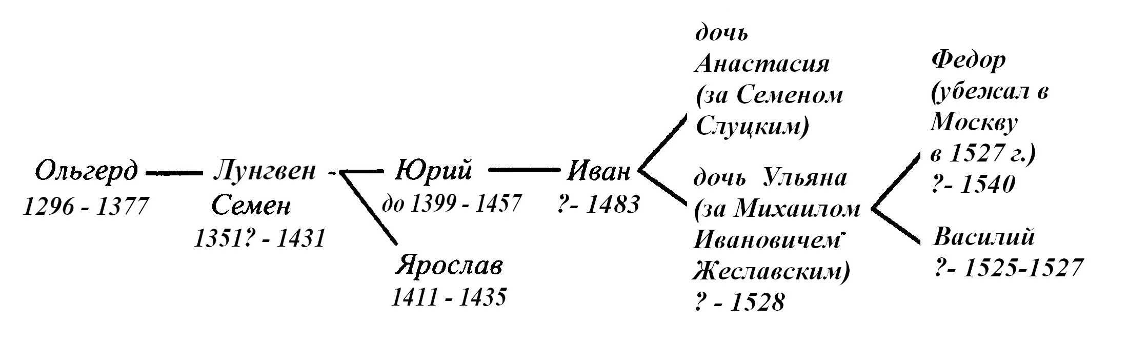 Младшая дочь Ивана Юрьевича Анастасия вышла замуж за князя Семена Михайловича Олельковича-Слуцкого, весьма известного в Литовском княжестве. Решительная, смелая, она переняла многие качества своих славных предков. Дед, видимо, больше импонировал ей, чем отец, который большую часть жизни провел в Мстиславле и был известен разве что богатыми пожалования церквам и манастырам. Семен и Анастасия имели дочь Александру и сына Юрия. Очень может быть, что имя свое княжич получил в честь прадеда – Юрия Лугвеньевича. Никто из его предков по мужской линии, Олельковичей-Слуцких, такого имени не носил.